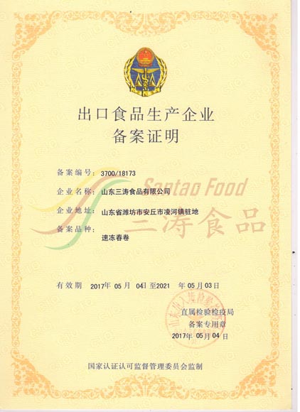 Frozen Spring Roll Export Registration Certificate
