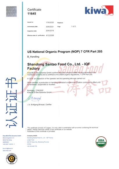 Organic Certificate for IQF Processing Plant